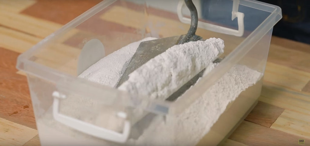 Para começar, é preciso misturar a argamassa com a água e fazer dessa combinação uma mistura homogênea nem muito grossa, nem muito rala. Use a bacia como recipiente e, enquanto você mexe, imagine o ponto de uma massa de bolo. Quando atingir este ponto, a argamassa estará pronta.