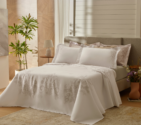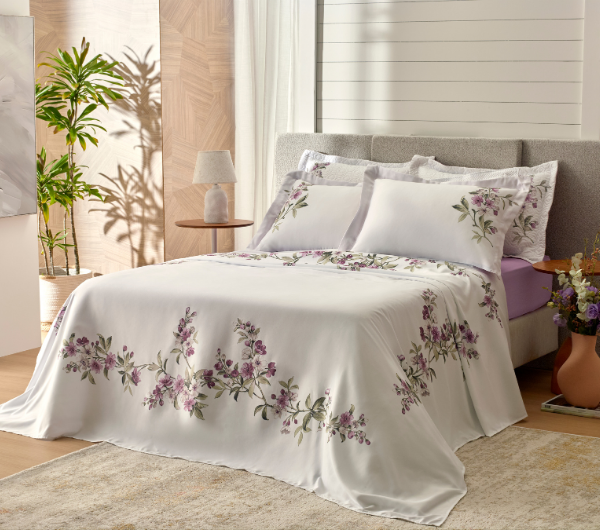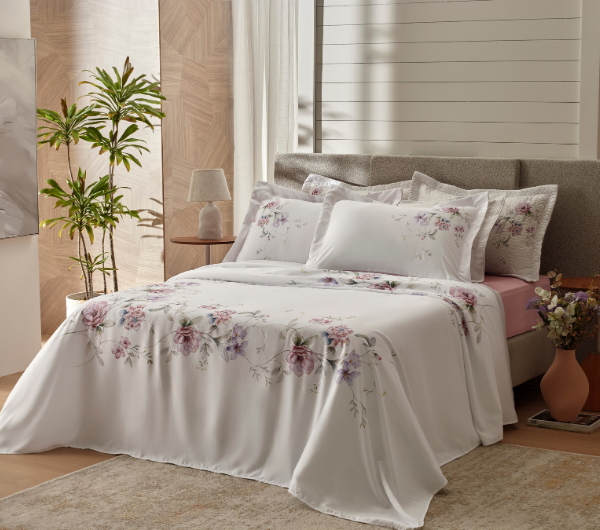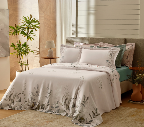 Uma estampa com efeito de pintura aquarela, que traz arte e delicadeza para a cama.