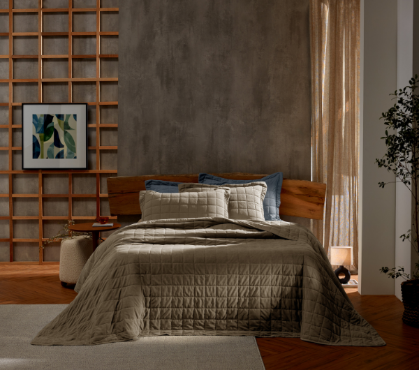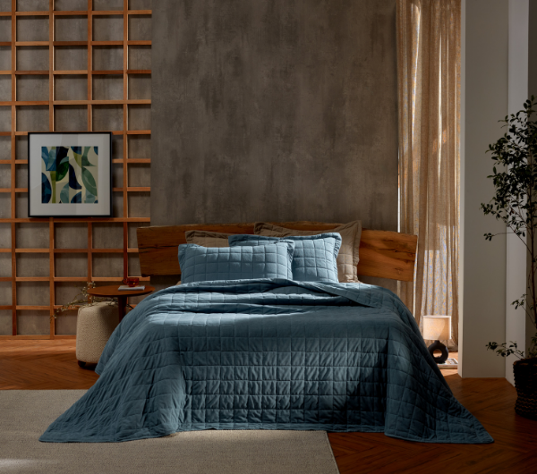 Uma colcha encorpada e com volume, que veste a cama de forma imponente e elegante