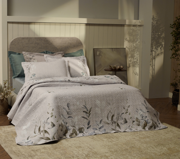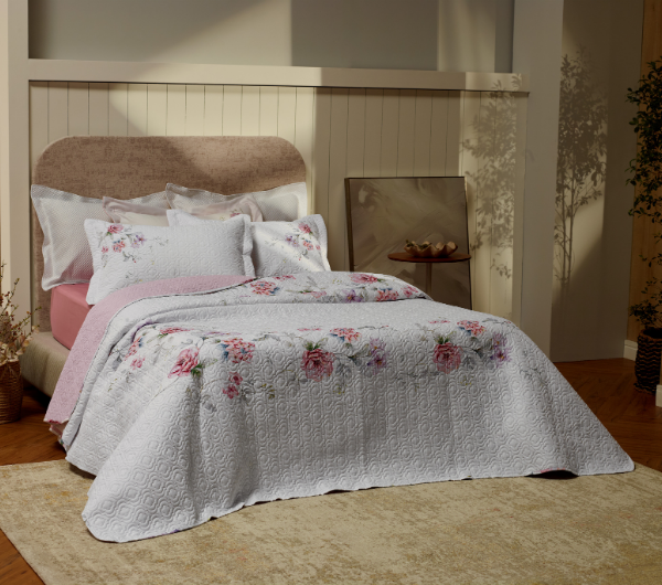 O Kit Colcha Portinari é um produto de alto apelo visual que atrai o cliente pelo design artístico e moderno. A estampa digital com efeito aquarelado, somada ao fato de ser dupla face, oferece dois produtos em um, um argumento de venda muito forte que o consumidor valoriza e entende como um ótimo investimento.