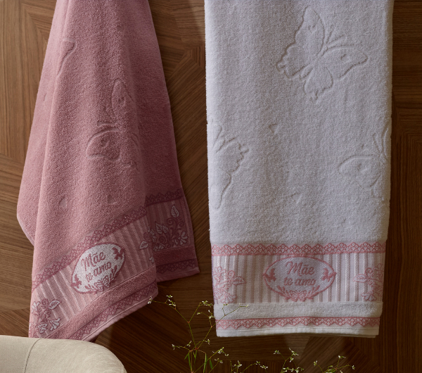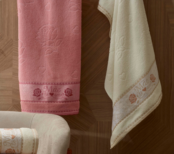 Além disso, a Toalha Dia das Mães é produzida com fio 24 retorcido e passa pelo processo de tumbler. Isso deixa o produto mais resistente, macio e suave.